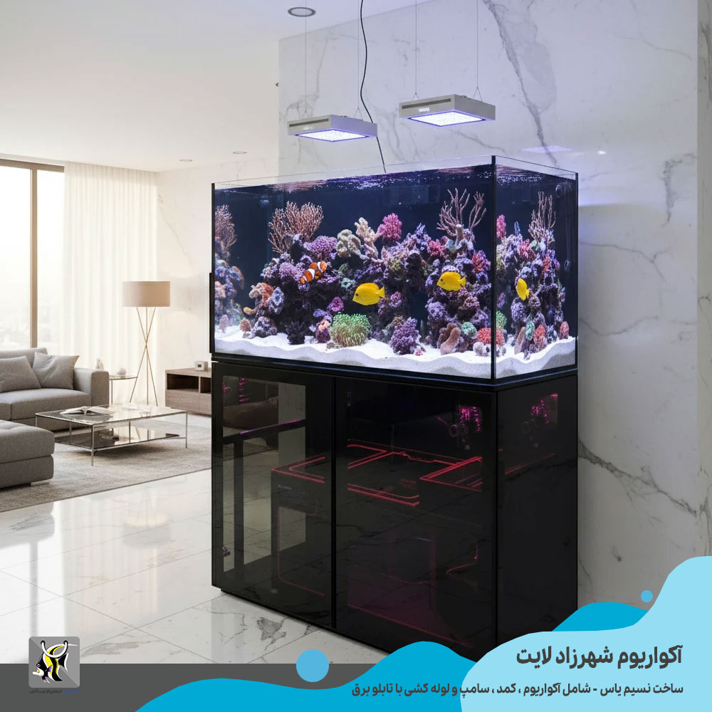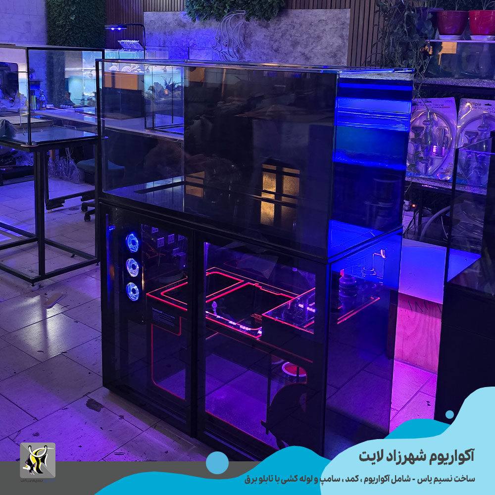 – آکواریوم آماده لاکچری به همراه کابین شیشه ای سری شهرزاد لایت نسیم یاس