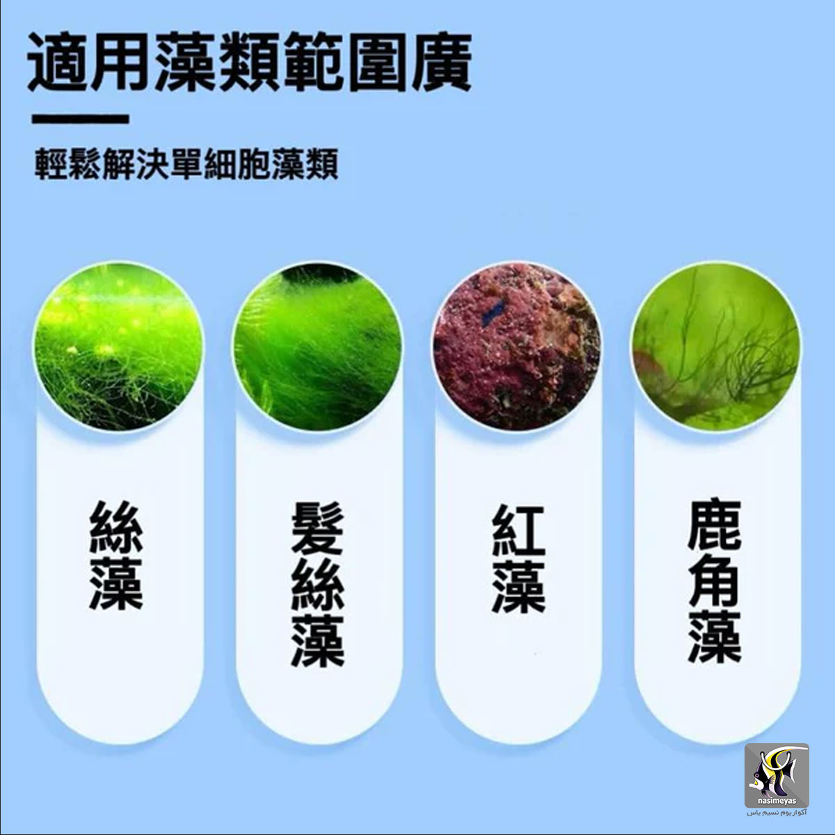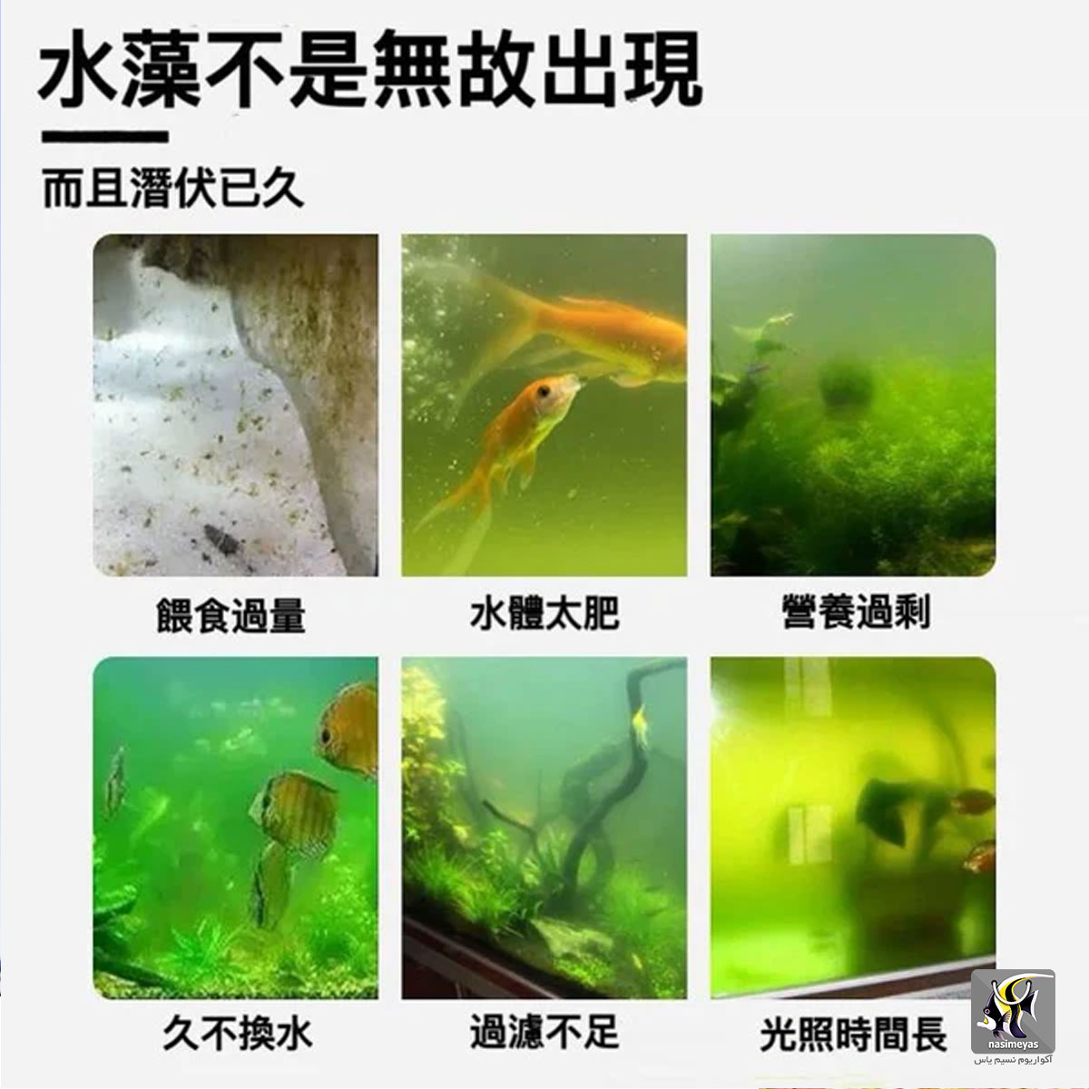 – این محصول که به طور خاص برای حوضچهها و آکواریومها طراحی شده است، به طور موثری جلبکهای سبز و خزهها را از بین میبرد و آب شما را شفاف و ماهیهای شما را سالمتر و شادابتر میکند.